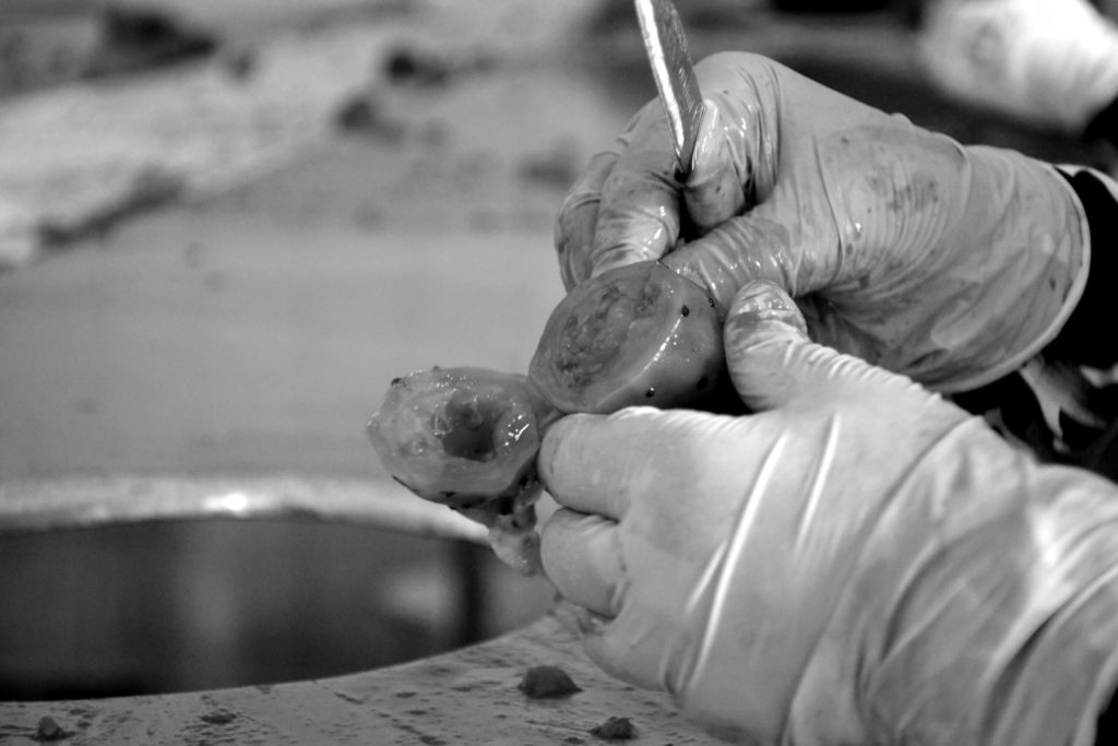L’équipe d’employés coupe les figues de barbarie pour en enlever la peau. Puis la figue est passée dans une presse qui sépare les graines du jus de la figue. Le jus de couleur violette qui sort suit un autre process pour fabriquer du vinaigre de figue de barbarie. Les graines restantes, sont lavées à l’eau pour enlever les résidus de fibres restants. Elles sont ensuite séchées sur des claies en inox. Puis, elles sont pressées à froid dans une machine dotée d’une vis sans fin. Pour obtenir un litre d’huile de pépins de figue de barbarie, il aura fallu 800 kilos de figues de barbarie. Ce travail très long, fastidieux, et le rendement très faible explique le coût élevé sur le marché de cette huile.